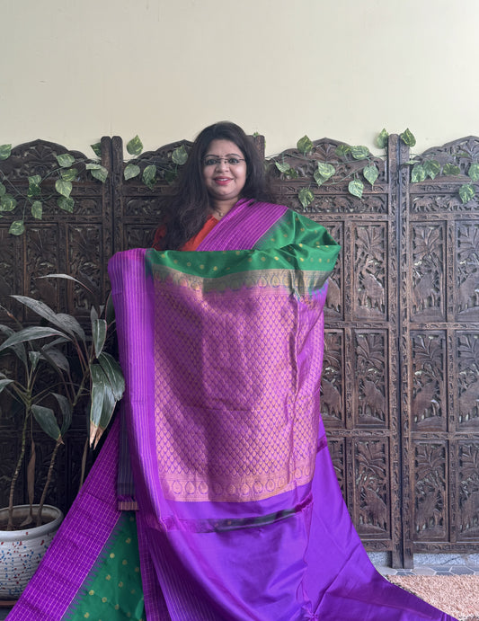 Transitioning from handloom to powerloom represented a significant evolution in the production of Gadwal sarees. This leap not only amplified their production rate but also introduced a level of precision and consistency in patterns that was harder to achieve manually. Primarily woven from silk, these sarees often feature cotton/silk bodies, making them uniquely lightweight yet luxurious. The fusion of materials is a testament to the innovative spirit of Gadwal weavers, who have continually adapted their crafts to meet the changing demands of fashion.Designs and Patterns
