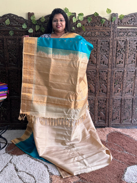 Peacock Blue Gadwal Silk Saree with Gold Zari Border — Pure Handloom | Silk Mark Certified