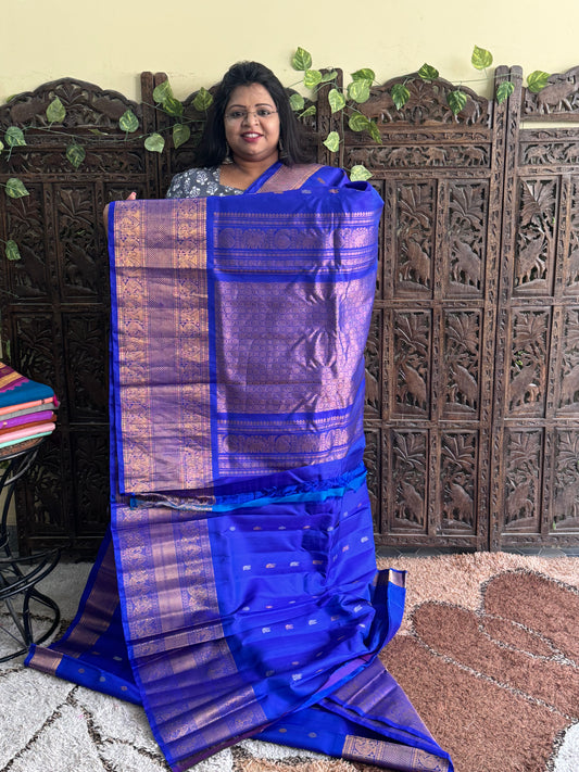 Blue Gadwal Silk Saree with Gold Zari Border — Pure Handloom | Silk Mark Certified