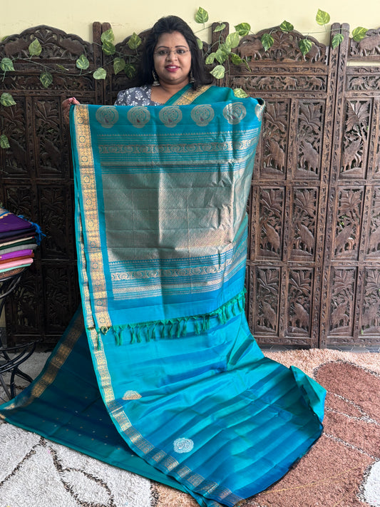 Sea Blue Gadwal Silk Saree with Gold Zari Border — Pure Handloom | Silk Mark Certified