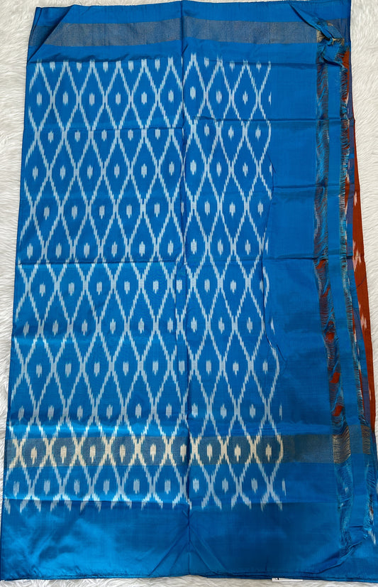 Ikkat Pattu Saree Rust Orange colored Saree complemented with a Blue Colored Ikkat border.