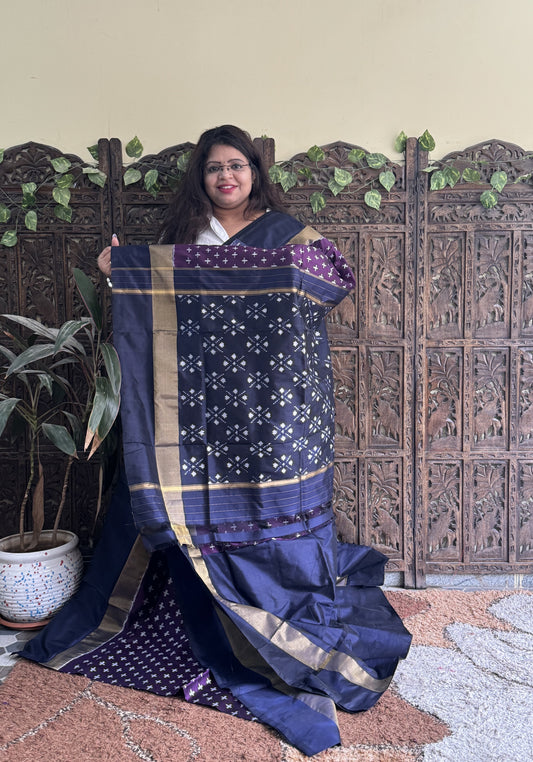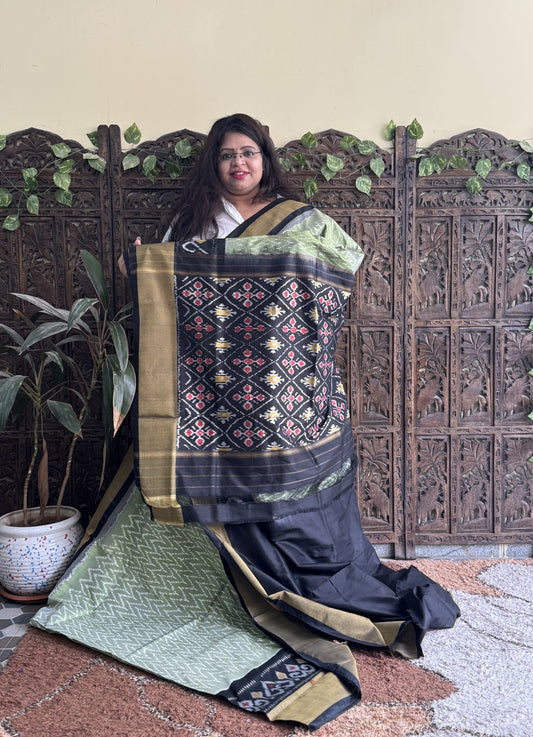 Ikkat Pattu Saree Black colored complemented with a Ikkat Zari border.