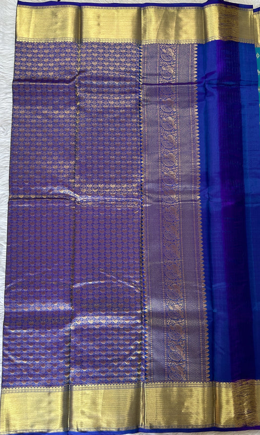 Kanjivaram Powerloom Silk Saree Aqua Blue colored Saree complemented with a Dark Blue Colored Gold Kanchi border.