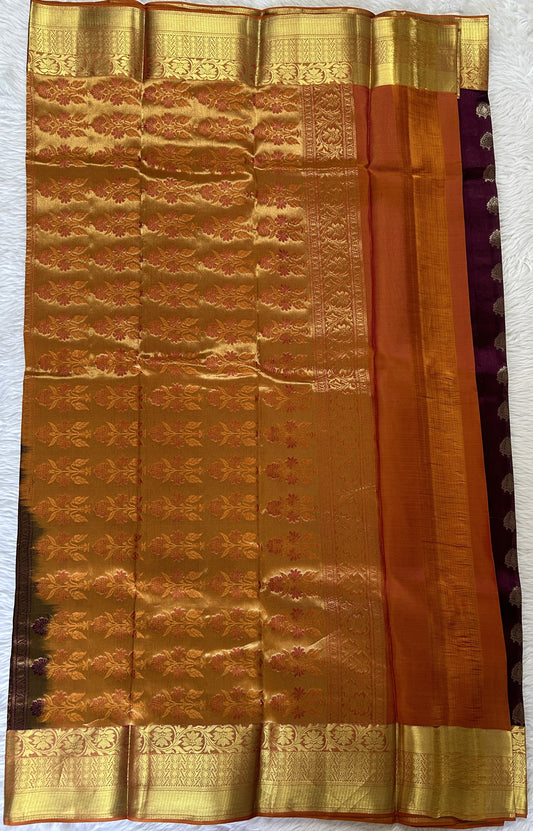 Kanjivaram Powerloom Silk Saree Magenta colored Saree complemented with a Orange Colored Gold Kanchi border.