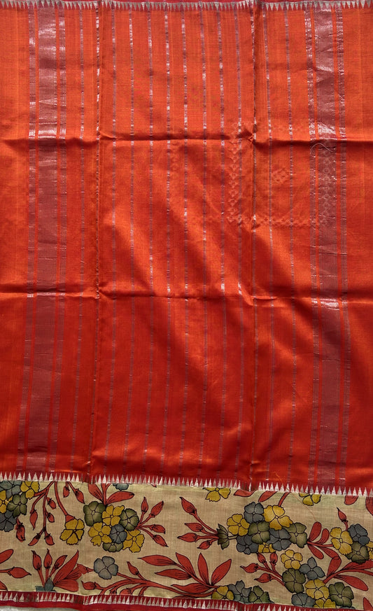 Mangalagiri Pen Kalamkari Saree Orange colored complemented with a Zari border.