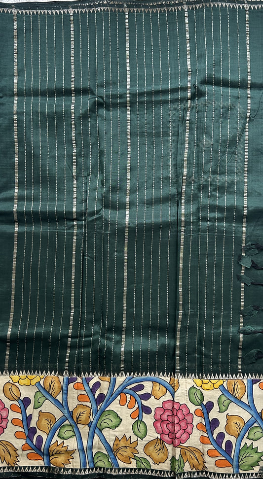 Mangalagiri Pen Kalamkari Saree Dark Green colored complemented with a Zari border.