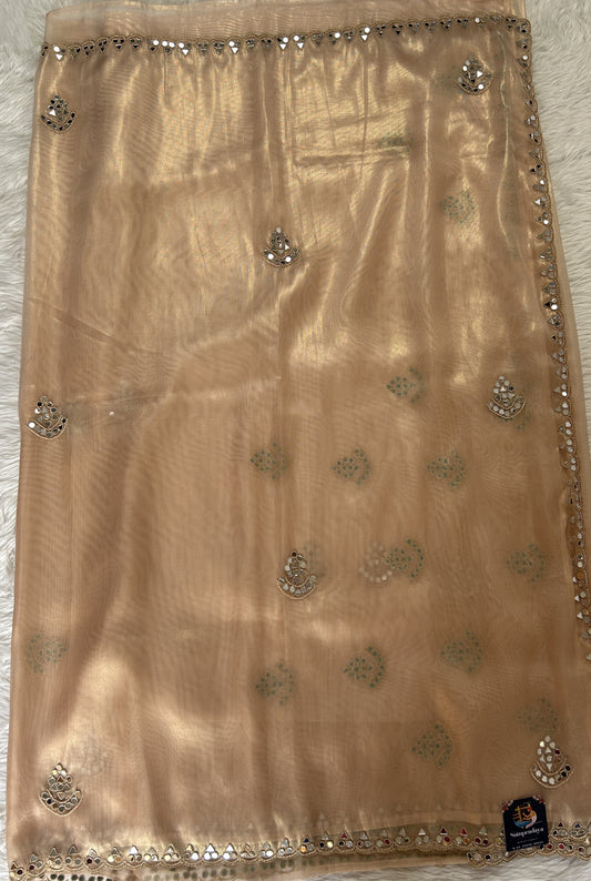 Tissue Organza Designer Saree Coral colored Saree complemented with a Handcrafted Mirror border.