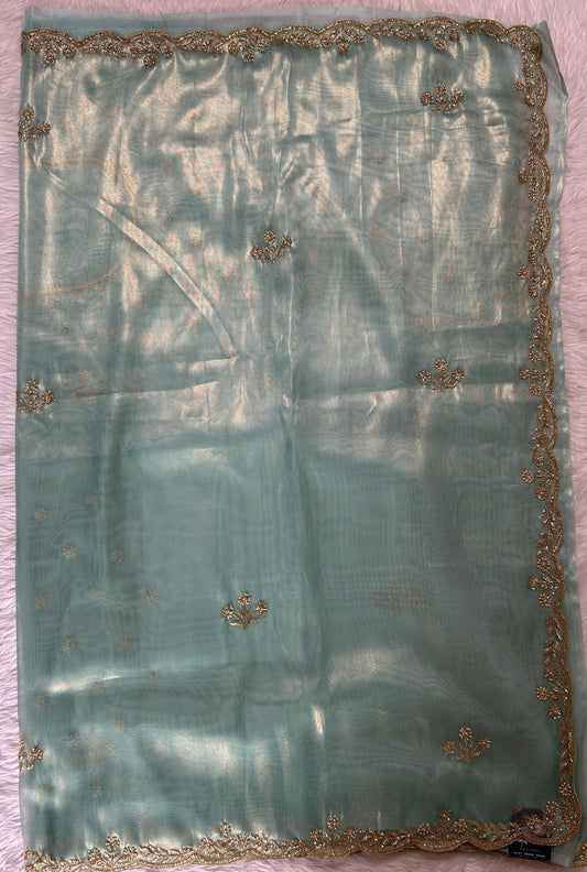 Tissue Organza Designer Saree Sea Blue colored Saree complemented with a Handcrafted border.