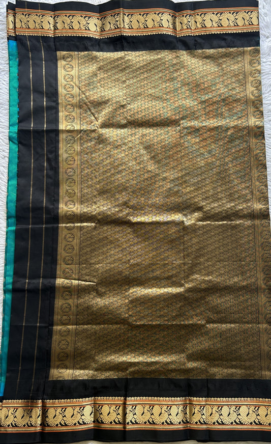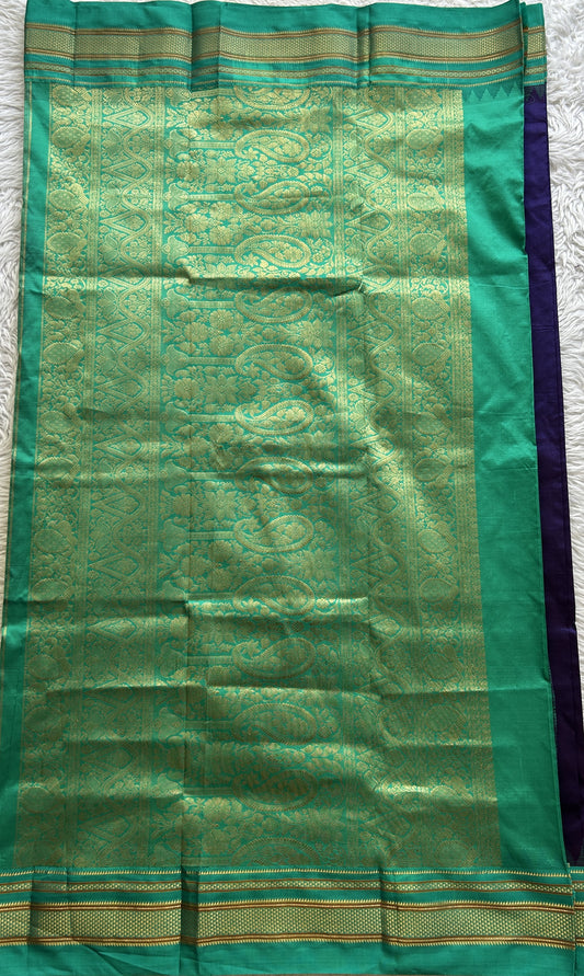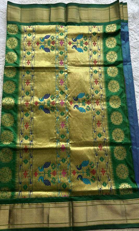 Narayanpet Silk Saree Peacock Blue Colored Complemented with a Green Zari Border.