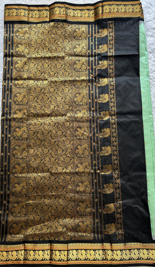 Narayanpet Silk Saree Mint Green Colored Complemented with a Black Zari Border.