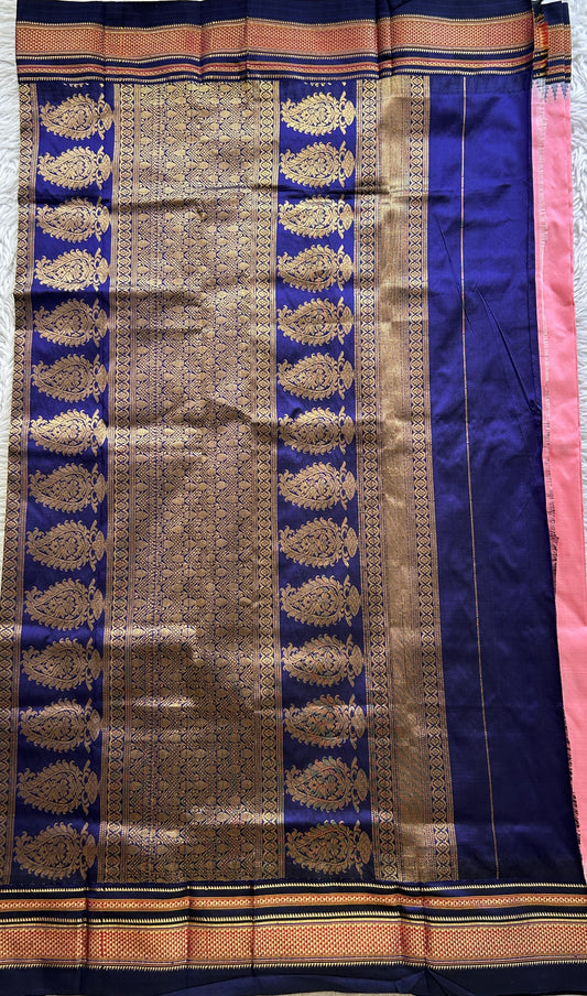 Narayanpet Silk Saree Pink Colored Complemented with a Navy Blue Zari Border.