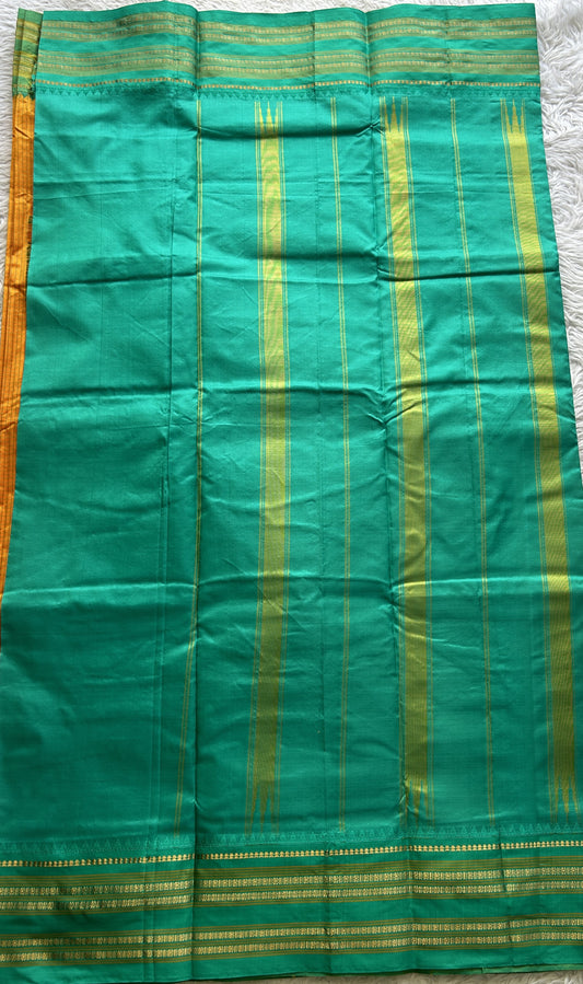 Narayanpet Silk Saree Orange Colored Complemented with a Rama Green Zari Border.