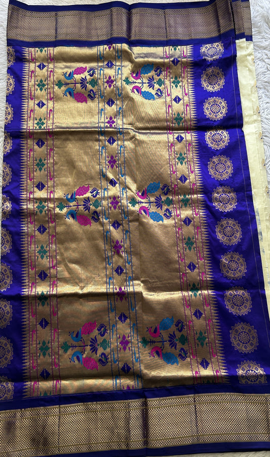 Narayanpet Silk Saree Cream Colored Complemented with a Rama Green Zari Border.