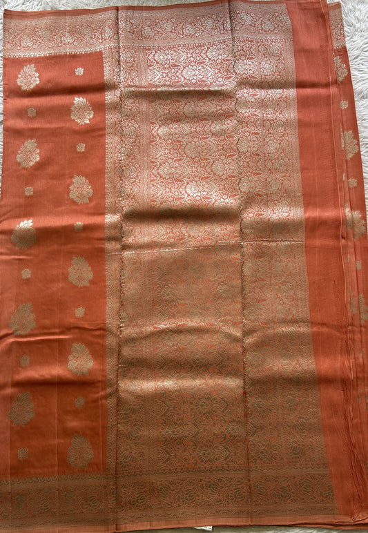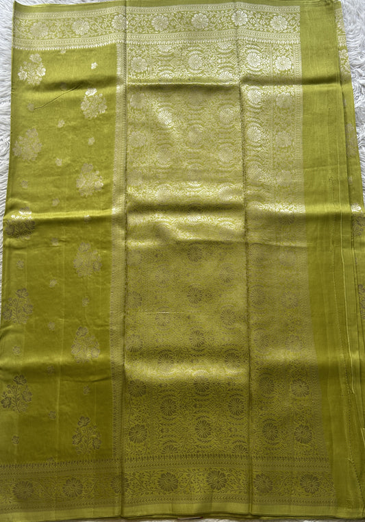 Banarasi semi georgette sarees feature Banarasi-inspired designs woven on semi georgette fabric, which offers a soft, flowy drape while maintaining visual richness.
