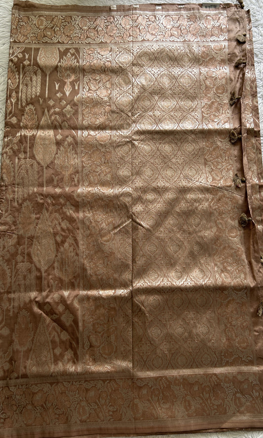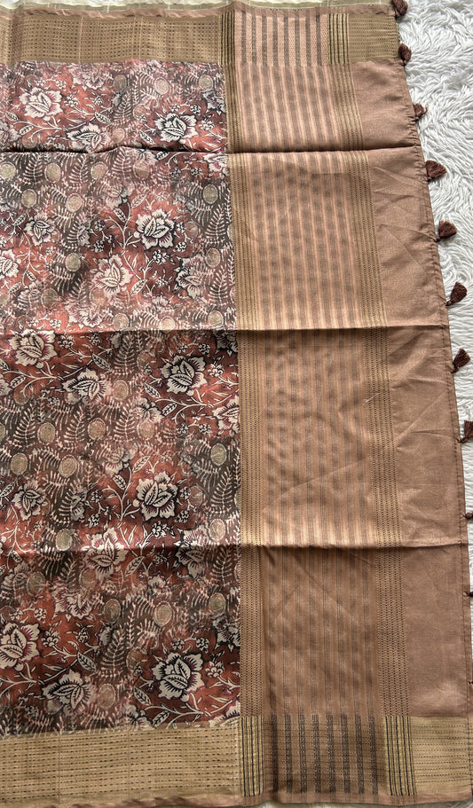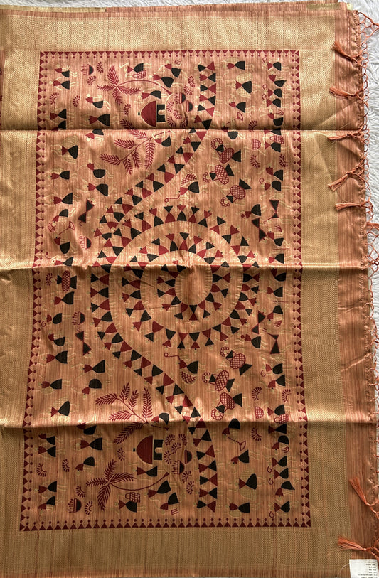 Semi Tussar Saree Dark Peach Colored complemented with a Zari Border.