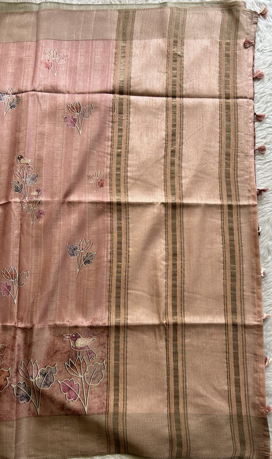 Semi Tussar Saree Peach Colored complemented with a Zari Border.