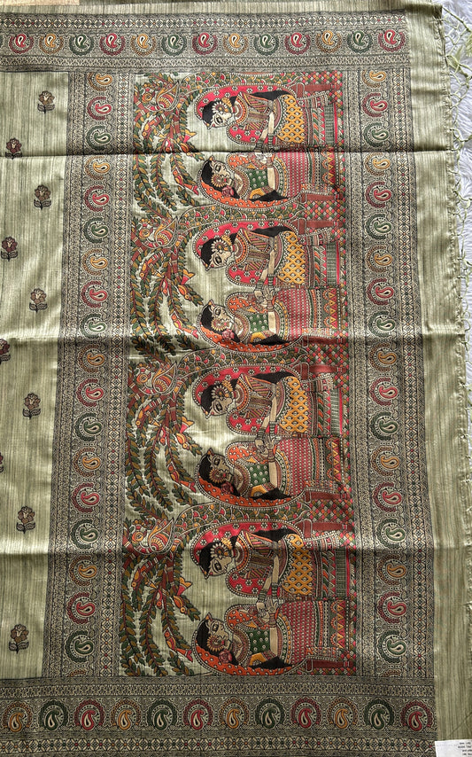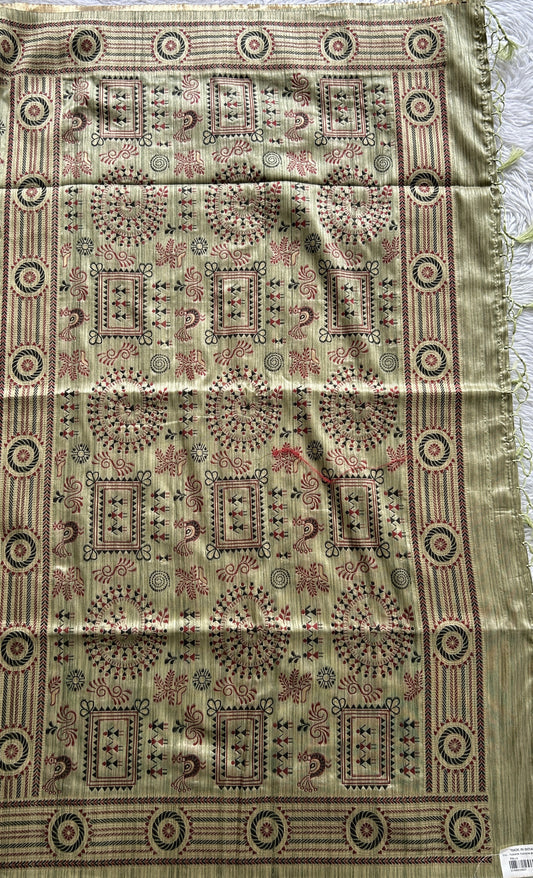 Semi Tussar Saree Olive Green Colored complemented with a Running Stich Border.