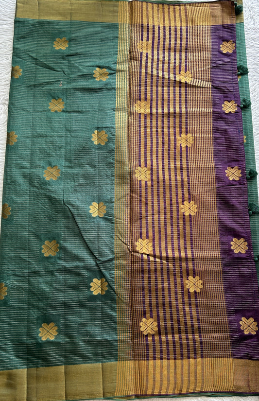 Semi Tussar Saree Bottle Green Colored complemented with a Gray Color Zari Border.