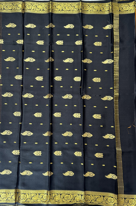 Mysore Crepe Silk Saree Black Colored Complemented with a Pink Zari Border.