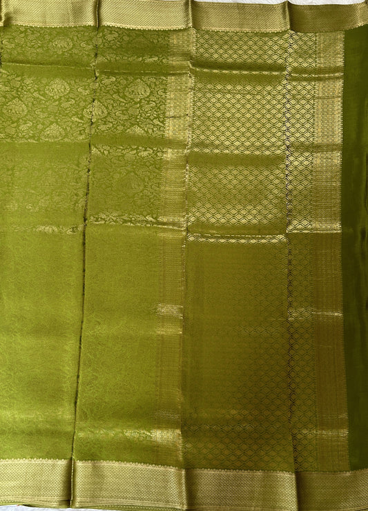 Banarasi Katan Silk Saree Olive Green Colored Complemented with a Zari border.