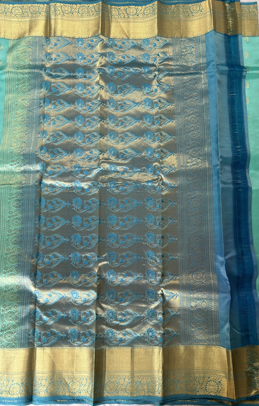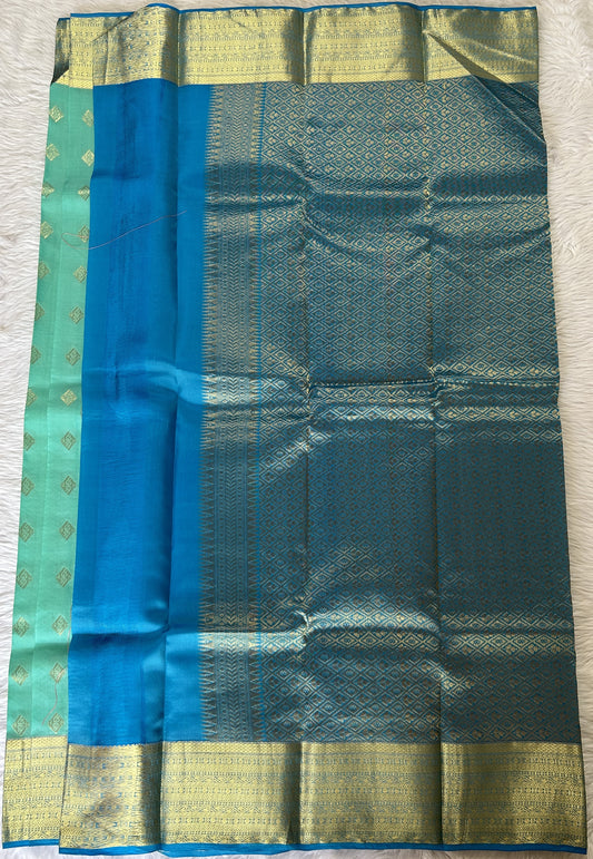 Kanjivaram Powerloom Silk Saree Aqua Blue colored Saree complemented with a Dark Blue Colored Gold Kanchi border.