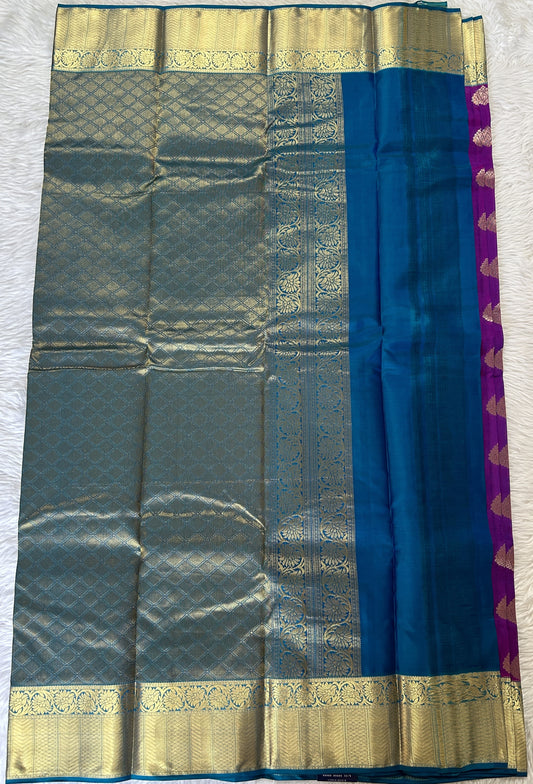 Pure Kanjivaram Soft Silk Saree Peacock Blue Colored Complemented with a Borderless Saree.