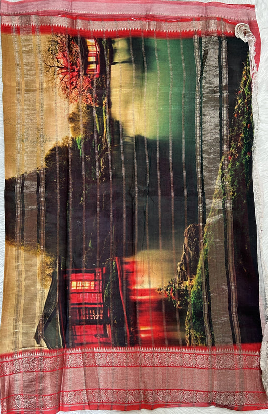 Mangalagiri Pattu Digital Print Saree Dark Bottle Green colored Saree complemented with a Red Colored Mangalagiri Border