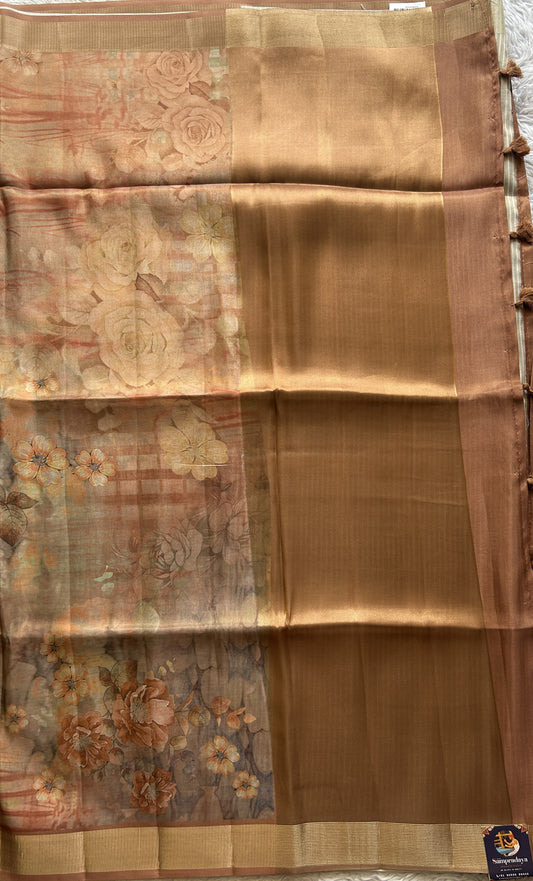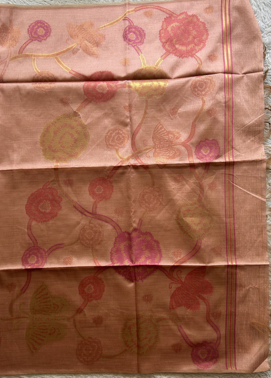 Semi Tussar Tissue Saree Peach Colored complemented with a Zari Border.