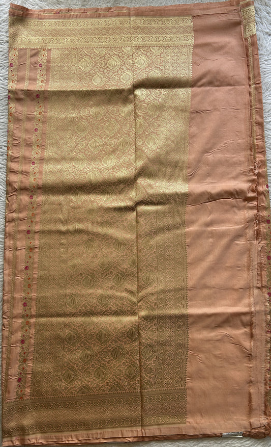 Pure Banarasi Crepe Silk Saree Light Peach Colored Complemented with a Zari border.
