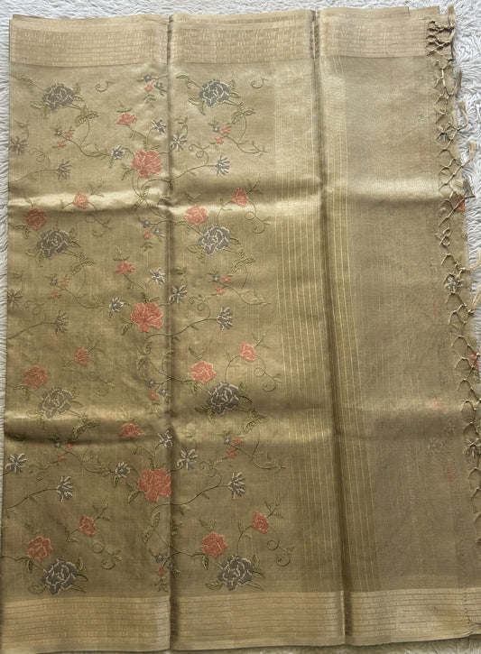 Tissue Organza Saree Beige Colored Elegantly Paired with a Zari Border.