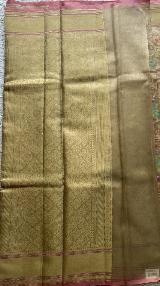 Tissue Organza Floral Saree Light Soft Coral Colored Elegantly Paired with a Zari Border.