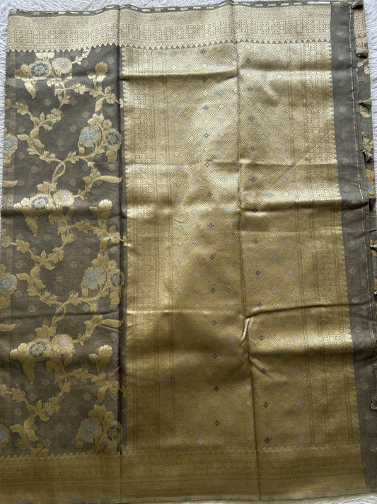 Tissue Organza Saree Ash Colored Elegantly Paired with a Zari Border.
