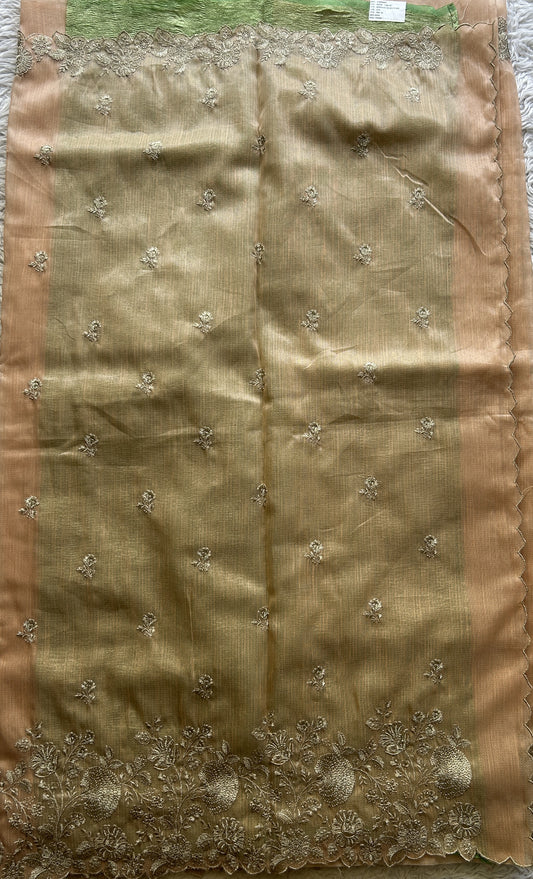 Tissue Organza Saree Peach Colored Elegantly Paired with a Embroidery Border.