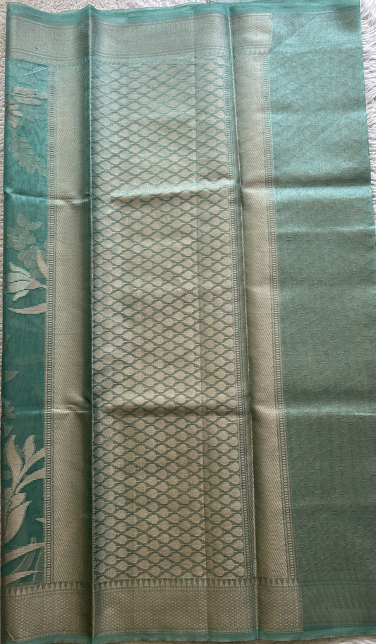 Tissue Organza Saree Light Sea Green Colored Elegantly Paired with a Zari Border.