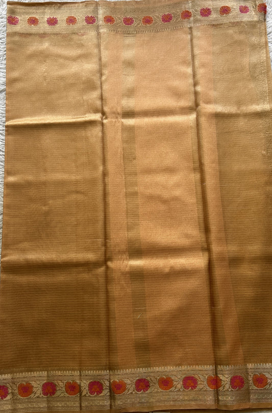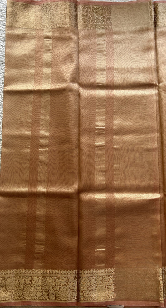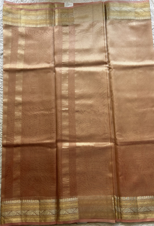 Tissue Organza Saree Peach Colored Complemented with a Zari Border.