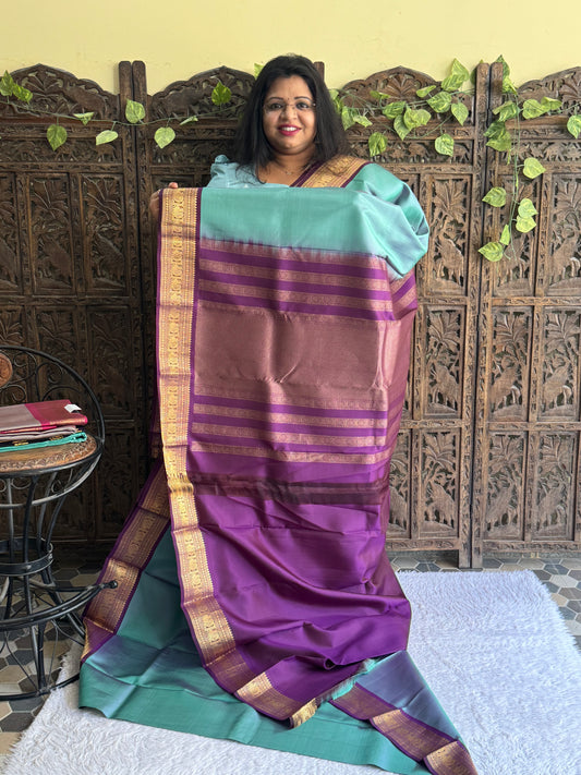 Pure Kanjivaram Silk Saree Light Teal Blue Colored Elegantly Paid with a Gold Zari Border.