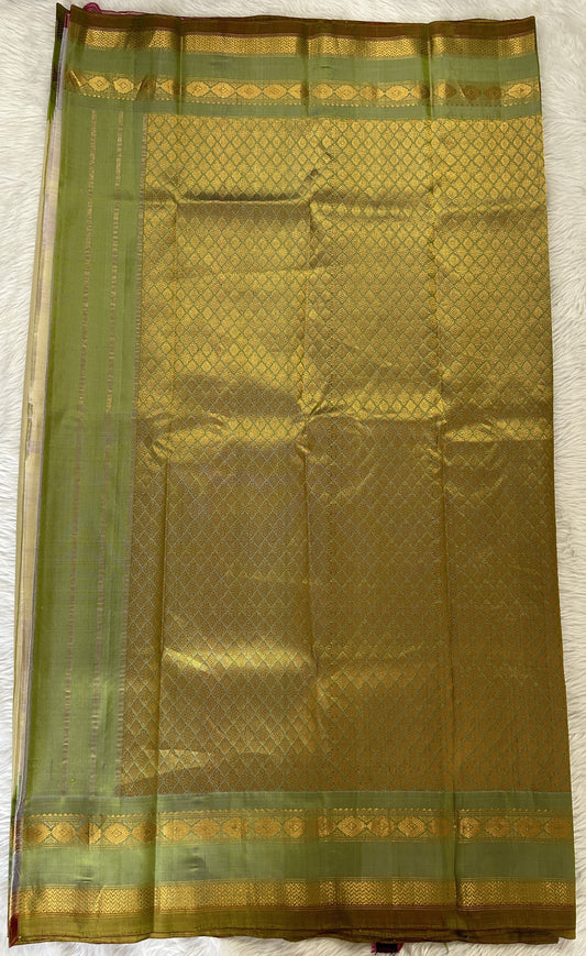 Gadwal Silk Saree Dark Green Colored Complemented With a Dark Orange Color Kanchi Border
