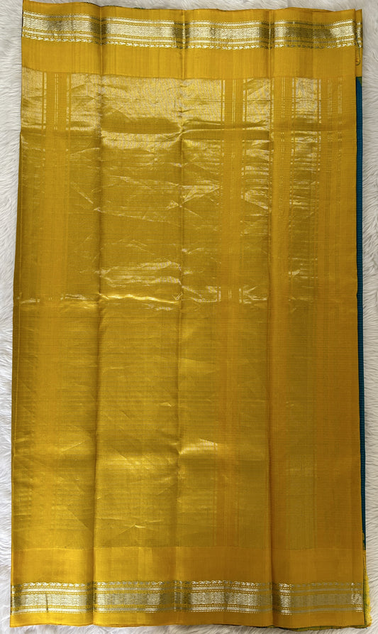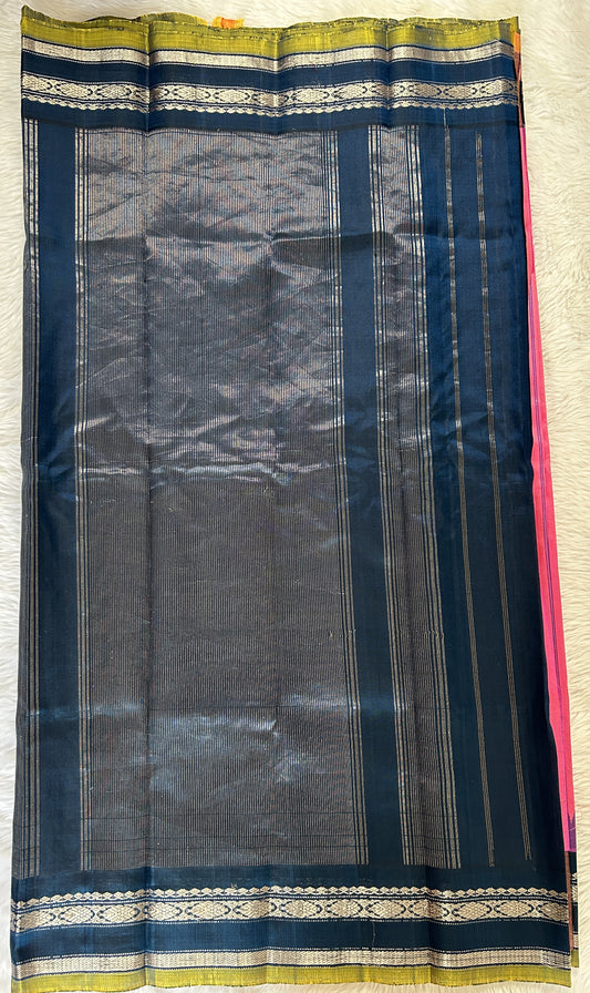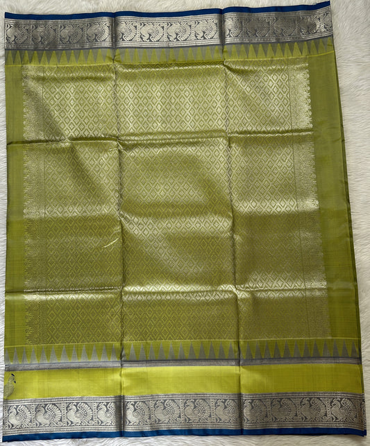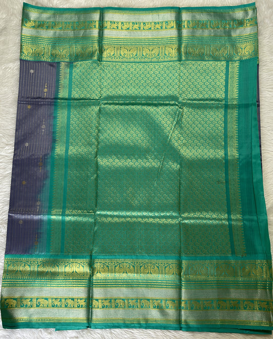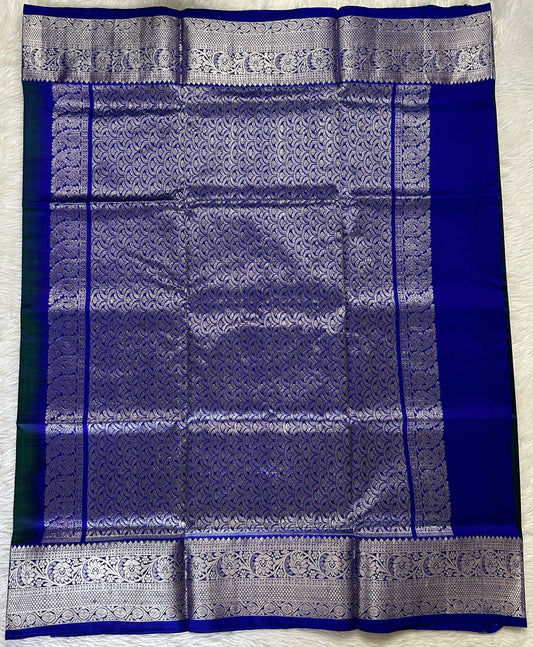 Venkatagiri Pattu Saree Peacock Green Colored Complemented With a Pattu Indigo Blue Kanchi Border