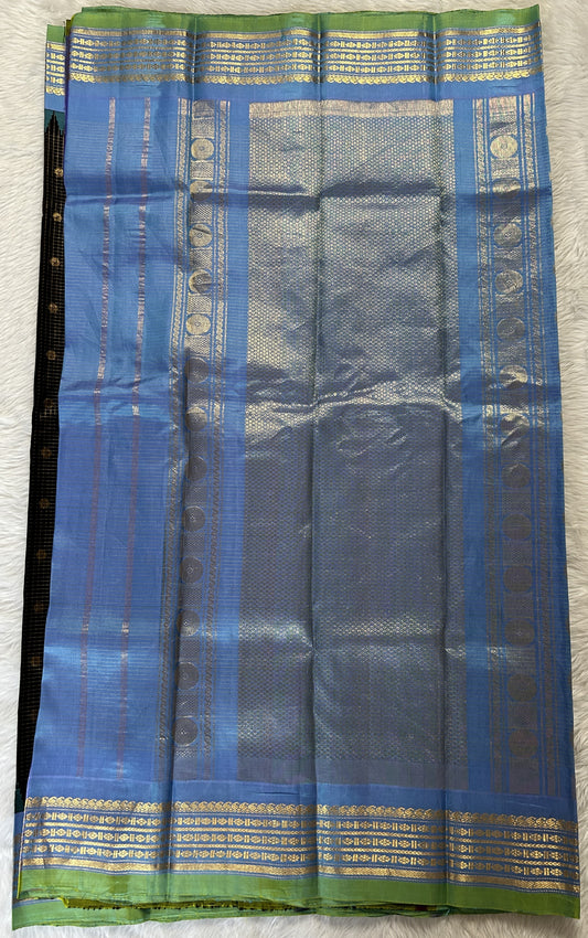 Gadwal Pattu Saree Pastel Green Colored Checks Saree Complemented With a Pattu Black Color Kanchi Gap Border