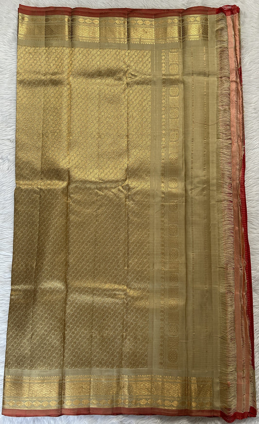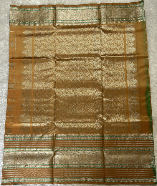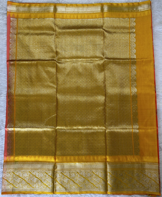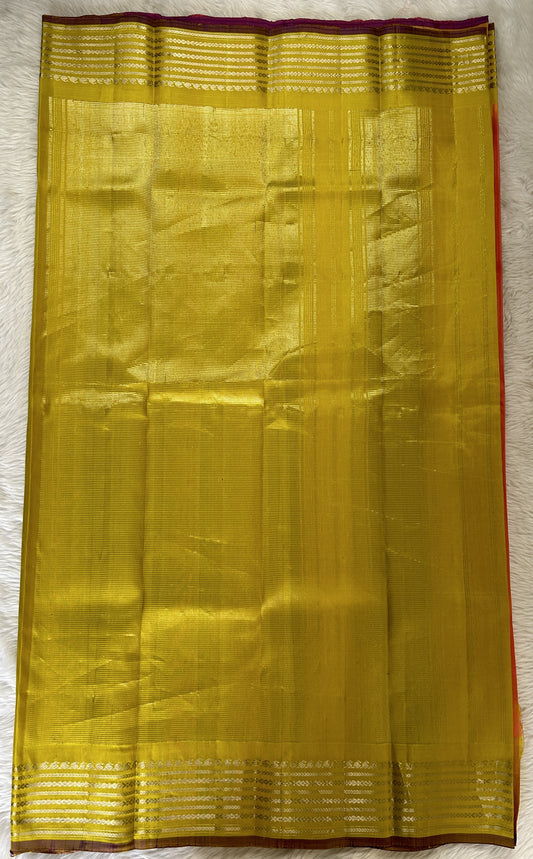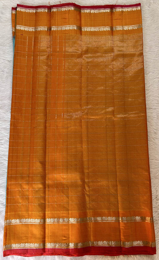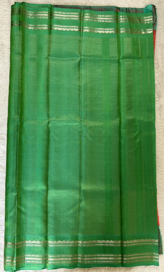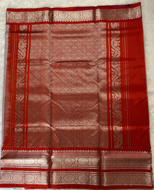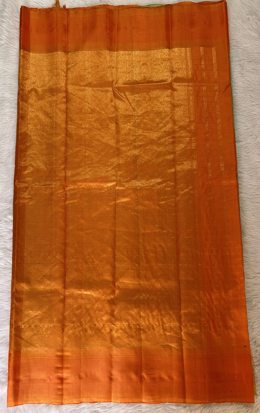 Gadwal Pattu Saree Dark Orange Colored Complemented With a Pattu Russian Green Color Kanchi Gap Border