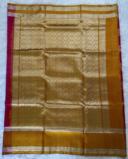 Gadwal Pattu Saree Mustard Yellow Colored Complemented With a Pattu Rose Pink Color Kanchi Border