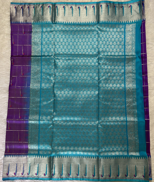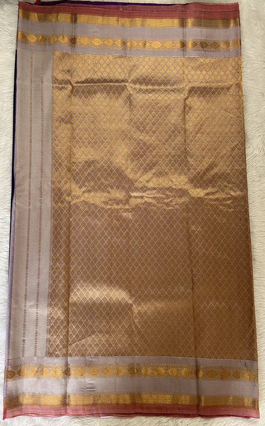 Gadwal Pattu Saree Dark Purple Colored Complemented With a Pattu Light Gray Color Kanchi Gap Border
