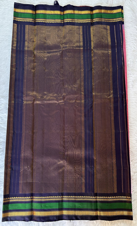 Gadwal Pattu Saree Dark Violet Colored Checks Saree Complemented With a Pattu Green Color Kanchi Gap Border