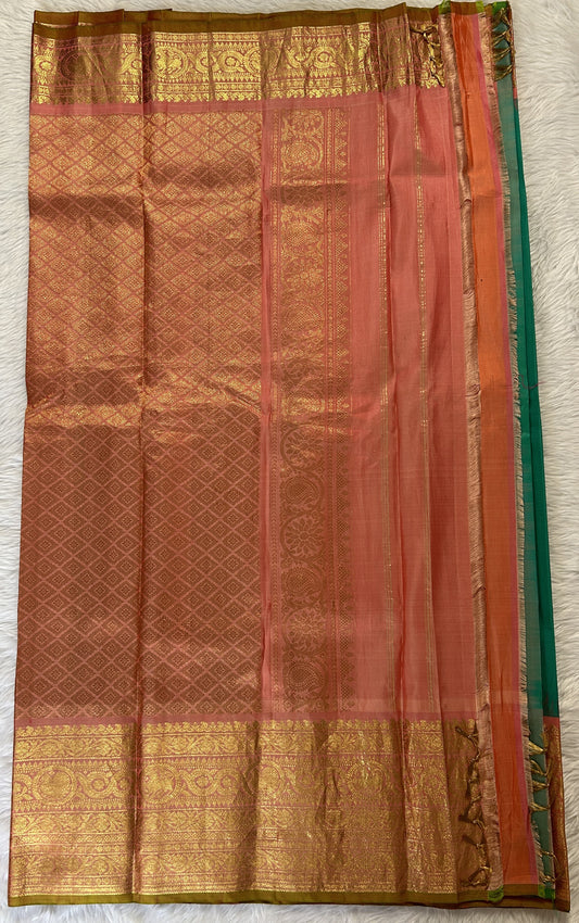 Gadwal Pattu Saree Dark Peach Colored Complemented With a Pattu Green Color Kanchi Gap Border