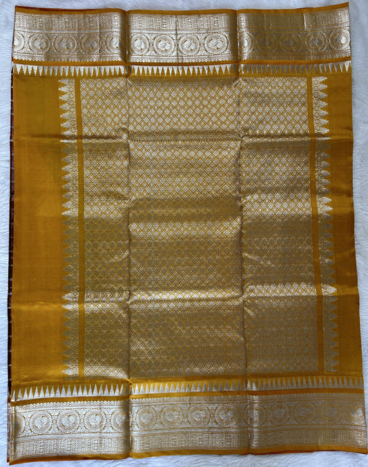 Gadwal Pattu Saree Brown Colored Complemented With a Pattu Pastel Orange Color Kanchi Border