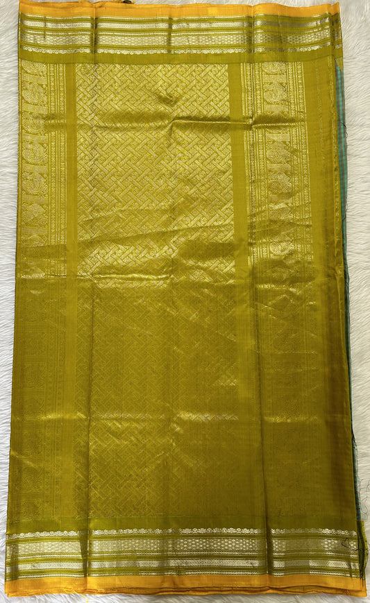 Gadwal Pattu Saree Sea Green and Beige Colored Checks Complemented With a Pattu Yellow Color Kanchi Border