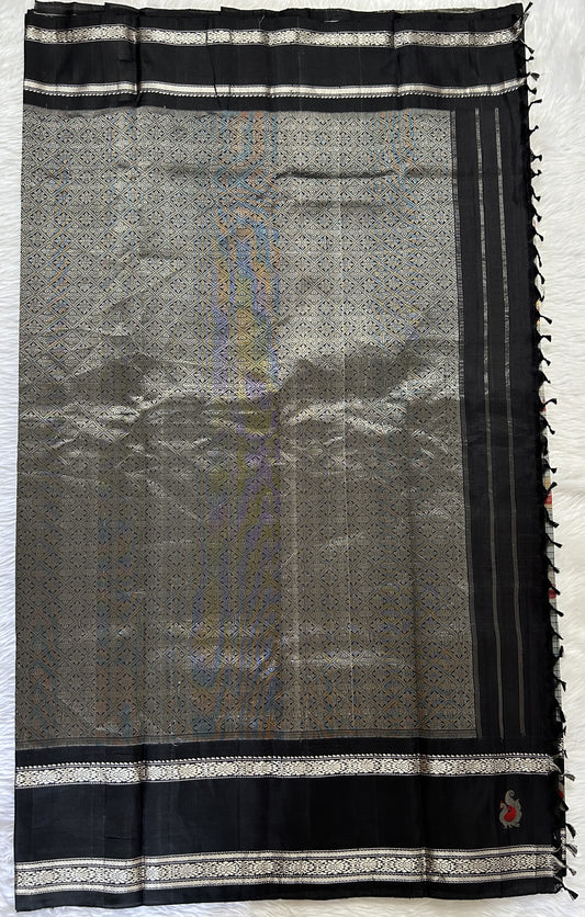 Gadwal Pattu Saree Gray Colored Checks Complemented With a Pattu Black Color Kanchi Border