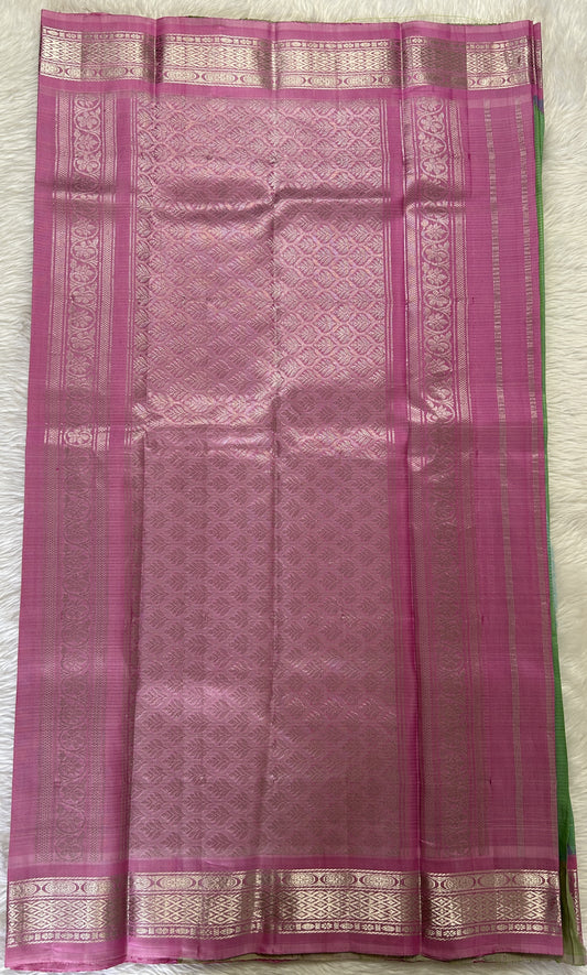 Gadwal Pattu Saree Green Colored Complemented With a Pattu Baby Pink Color Kanchi Border