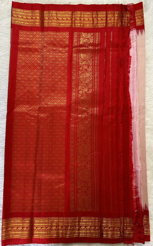 Gadwal Pattu Saree Pastel Pink Colored Complemented With a Pattu Red Color Kanchi Border