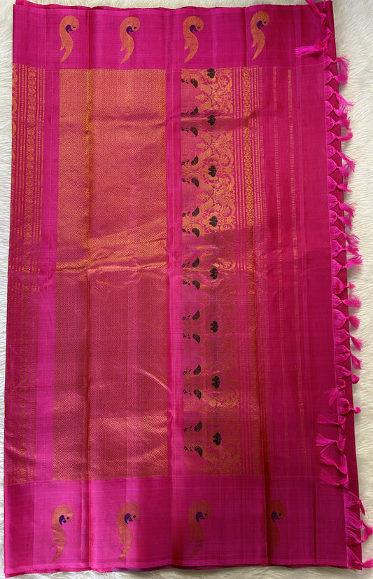 Venkatagiri Pattu Saree Pink Colored Complemented With a Pattu Pastel Orange Color Kanchi Border